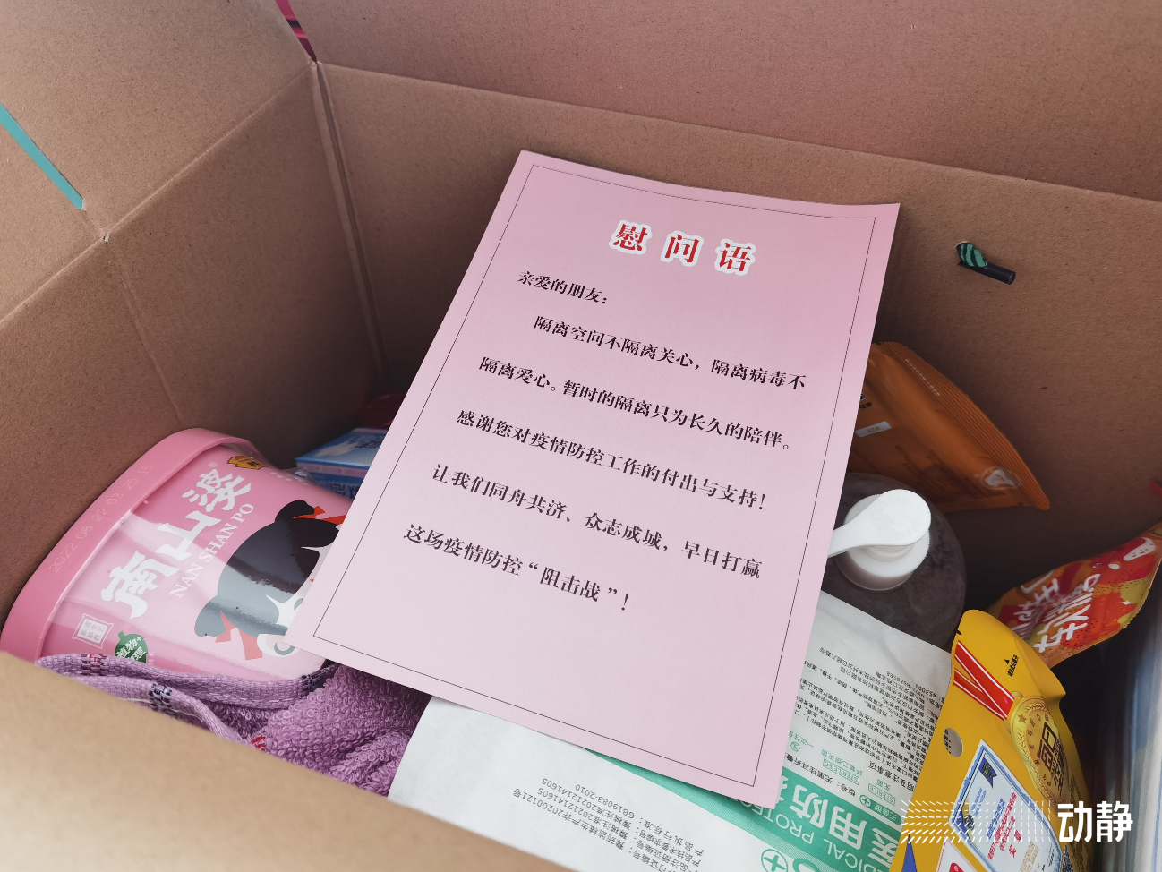 打开爱心礼包,一封慰问信首先传递了大家对隔离点人员的关心与关爱。礼包内有口罩、免洗手消毒液等防疫物资,也有毛巾、牙刷、牙膏、肥皂等生活物资,还有水果、刺梨软糖、乳酸菌、坚果、酸汤粉等食品,让隔离点人员感受到社会的关爱,坚定抗击疫情的信心。