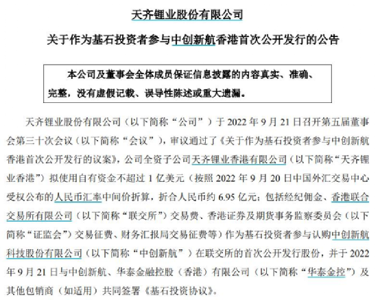 其中,天齐锂业此次斥资1亿美元认购中创新航基石投资份额,算是与其“互粉”。今年5月,天齐锂业H股上市之前,便与中创新航签署了《战略合作伙伴协议》和《碳酸锂供应框架协议》,双方计划在锂电产业链各个环节展开相关合作。同时,中创新航作为基石投资人,投资约5000万美元参与了天齐锂业的H股发行。天齐锂业此次成为中创新航基石投资者后,两家公司实现交叉持股。