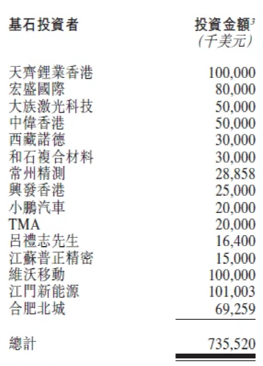 不难看出,15个基石投资者中,既有上游供应商,提供包括锂精矿、镍钴材料、正极材料前驱体、电解铜箔和锂电设备,又有下游客户小鹏汽车。单从名单上看,已经形成了近乎完整的新能源汽车动力产业链。
