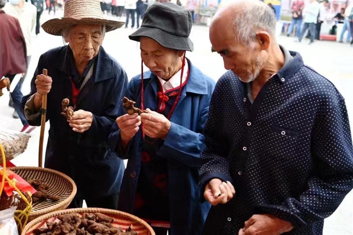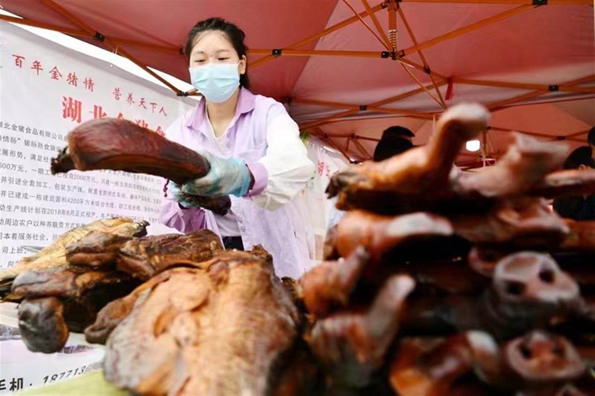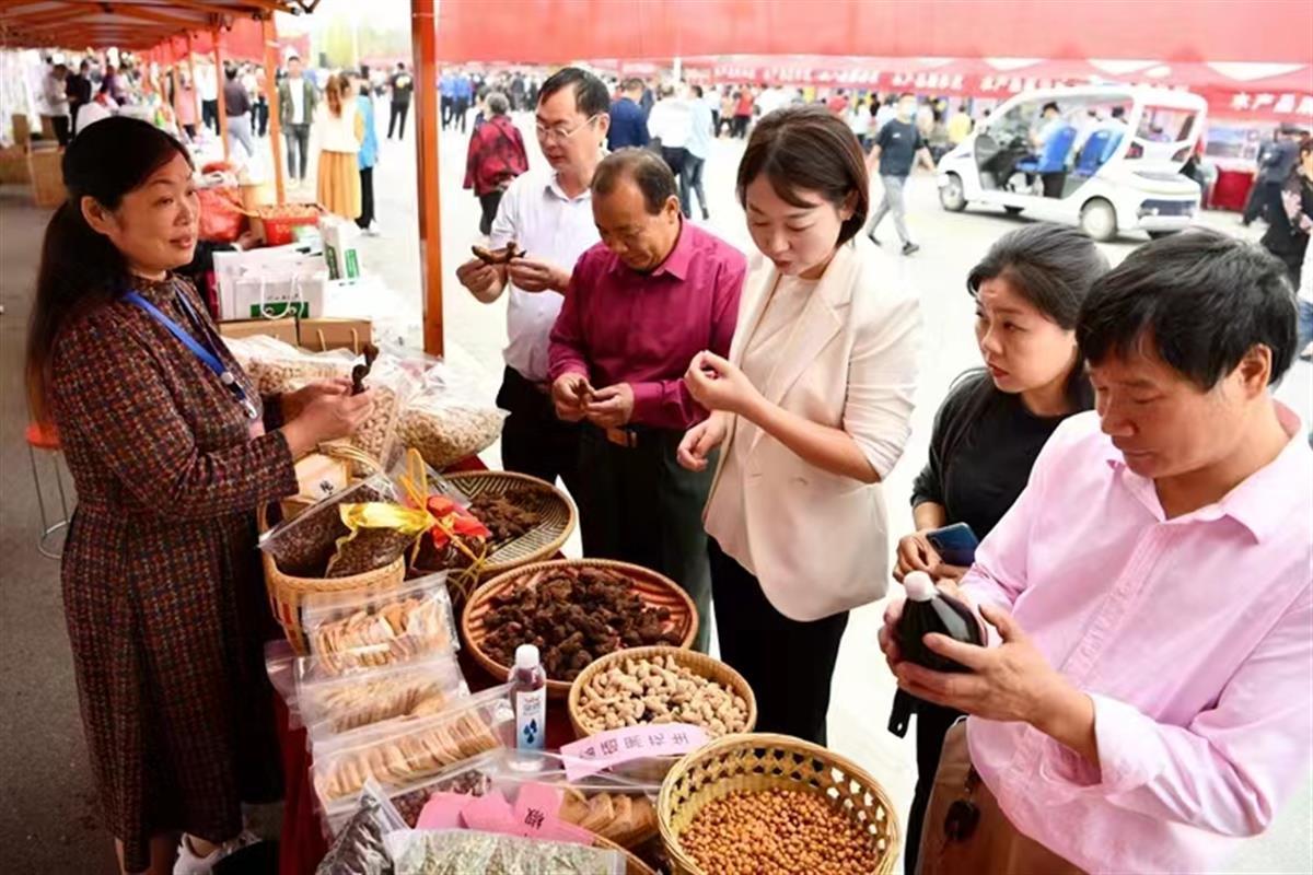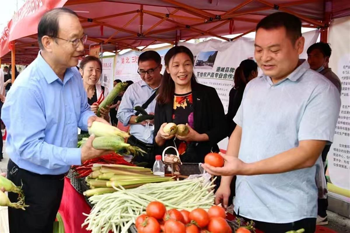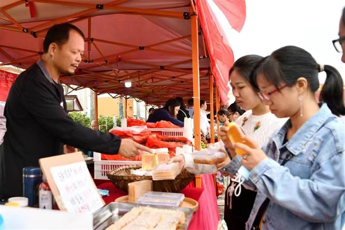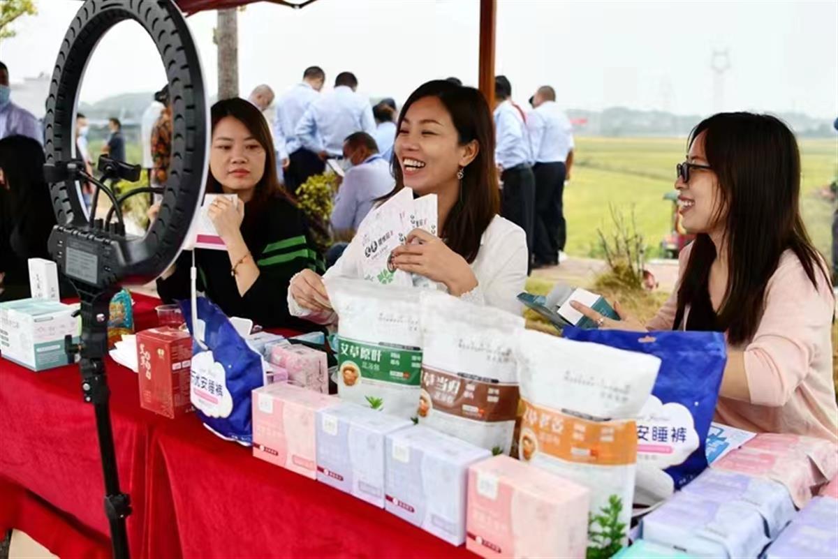 2022年9月23日,咸宁市通城县在大坪乡坪山村举行以“庆丰收,迎盛会”为主题的农民丰收节通城农副产品赶集活动,举办了机收丰收现场直播。百多家农企展出近千余种农产品,农民网红通过现场直播带货的方式,销售农产品,帮助农企、农民增收,热闹非凡。(刘建平 摄)