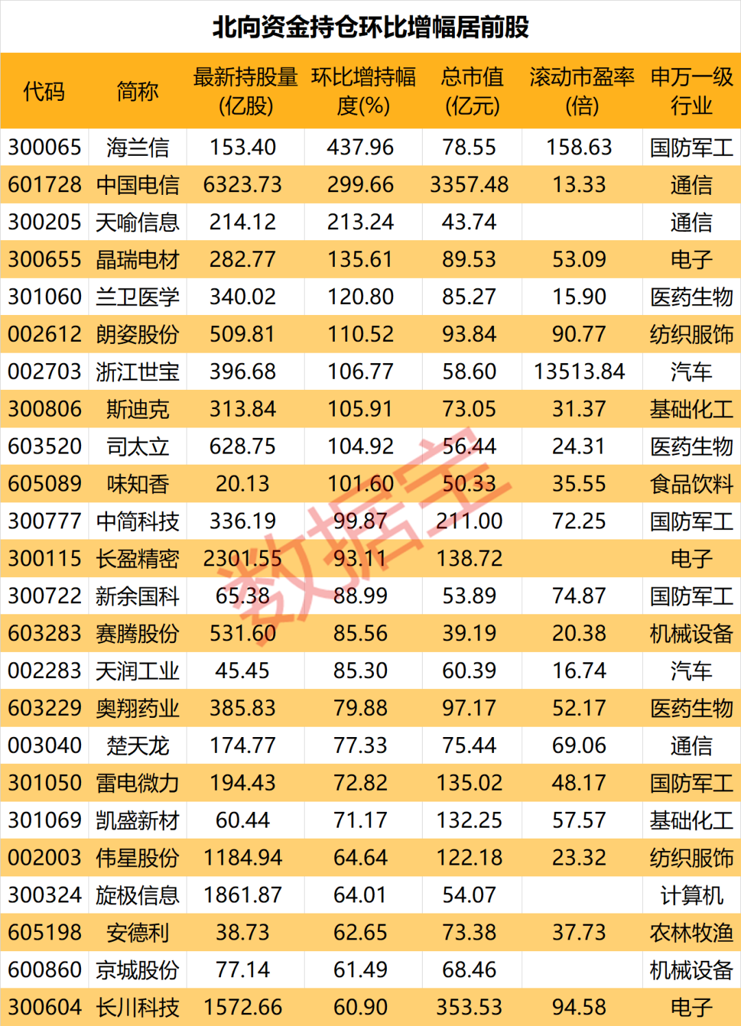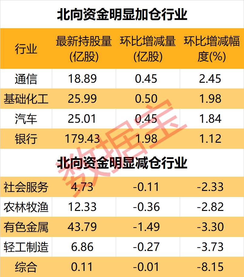 通信行业获北向资金最大幅度加仓,持股量环比增长2.45%。