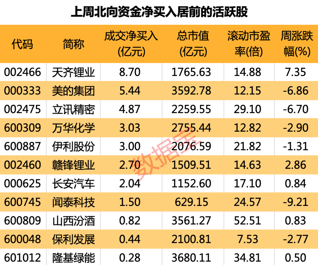数据宝统计,上周共计30股登上北向资金成交活跃榜。成交以净卖出居多,多达15股净卖出破亿。从概念板块看,锂资源股获青睐,天齐锂业以8.7亿元的净买入高居榜首,赣锋锂业也获2.7亿元净买入。下游的宁德时代和亿纬锂能则遭到北向资金不同程度净卖出。