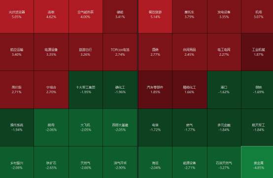 板块方面,赛道股再度反弹,储能、光伏、热泵等板块多股涨停。另外,临近国庆假期,餐饮旅游、酒店航空、免税店等概念表现活跃,华天酒店、众信旅游涨停。而能源股遭遇回调,国内商品期市午盘普跌,能化品、油脂油料跌幅居前。