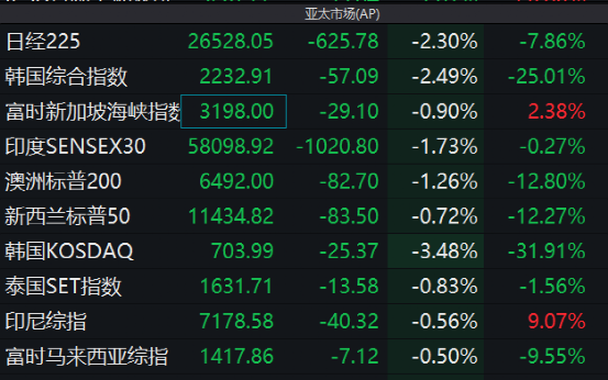 亚太市场今日开盘下挫,日韩股指均跌超2%。