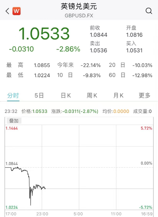 另外,英国政府宣布大规模减税计划,英镑遭重挫,英镑兑美元一度跌破1.03,刷新历史新低。截止发稿,英镑兑美元GBP/USD现报1.0474美元。据央视新闻报道,23日,英国政府宣布了一系列经济刺激措施,包括大规模减税、取消银行业奖金上限等,希望以此来提振即将陷入衰退的英国经济。