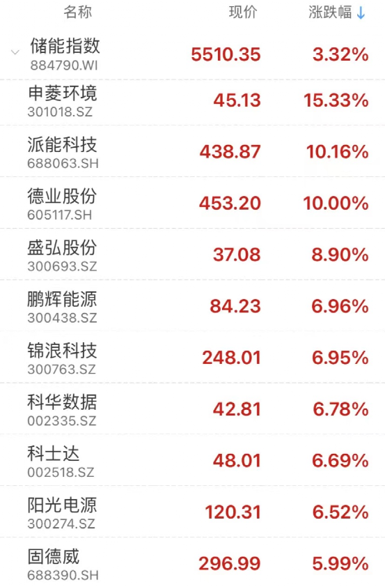 储能板块震荡走强,同飞股份、申菱环境、新风光、派能科技涨超10%,英维克涨停,盛弘股份、科华数据、科士达、阳光电源涨超5%。