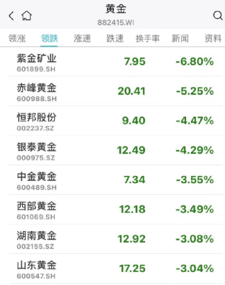 金价破位下行,黄金股普跌。紫金矿业、恒邦股份、中金黄金、赤峰黄金等纷纷走低。