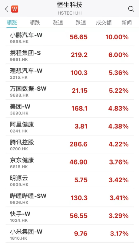 港股方面,三大指数集体反弹,恒生科技指数早盘直线拉升,涨幅扩大至2.6%。其中,小鹏汽车涨超10%,理想汽车涨超5%,美团、腾讯控股、小米集团、携程集团等涨超3%。