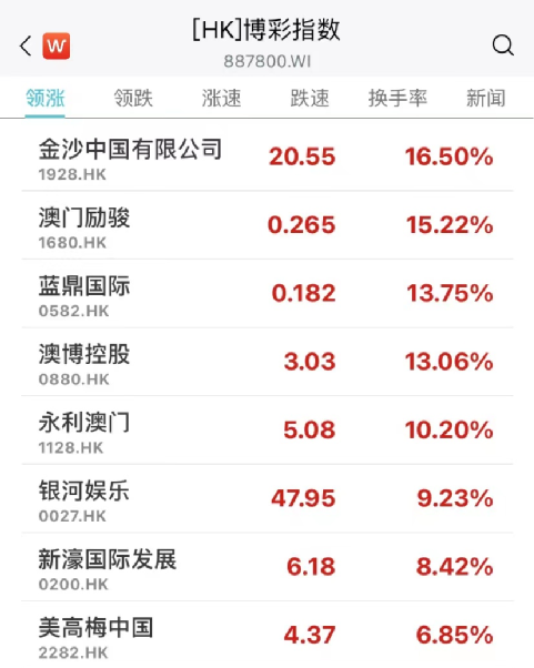 博彩股表现活跃,涨幅居前。金沙中国大涨超17%,金沙中国涨超16%,澳门励骏涨超15%,澳博控股、永利澳门、银河娱乐涨。消息面上,内地赴澳旅行团及电子签注料下月底落实,澳门赌牌竞投本周起开展首轮磋商。