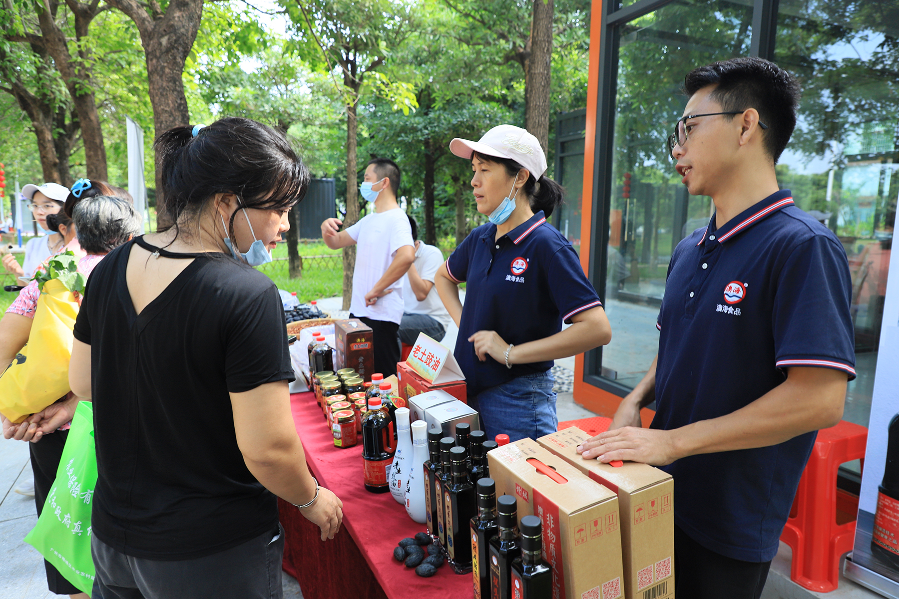特色精致的丰收布景、摞满蔬菜的篮子、堆叠成山的瓜果……丰收节现场充分利用了园区的彩色集装箱,设置了特色农作物展示区。在秋日的暖阳下,沿着创意园的林荫小道走进会场,乌榄、香蕉、葡萄、番薯等各色农产品琳琅满目,一派丰收景象,好不热闹,吸引了村民、游客纷纷驻足选购,观赏拍照。