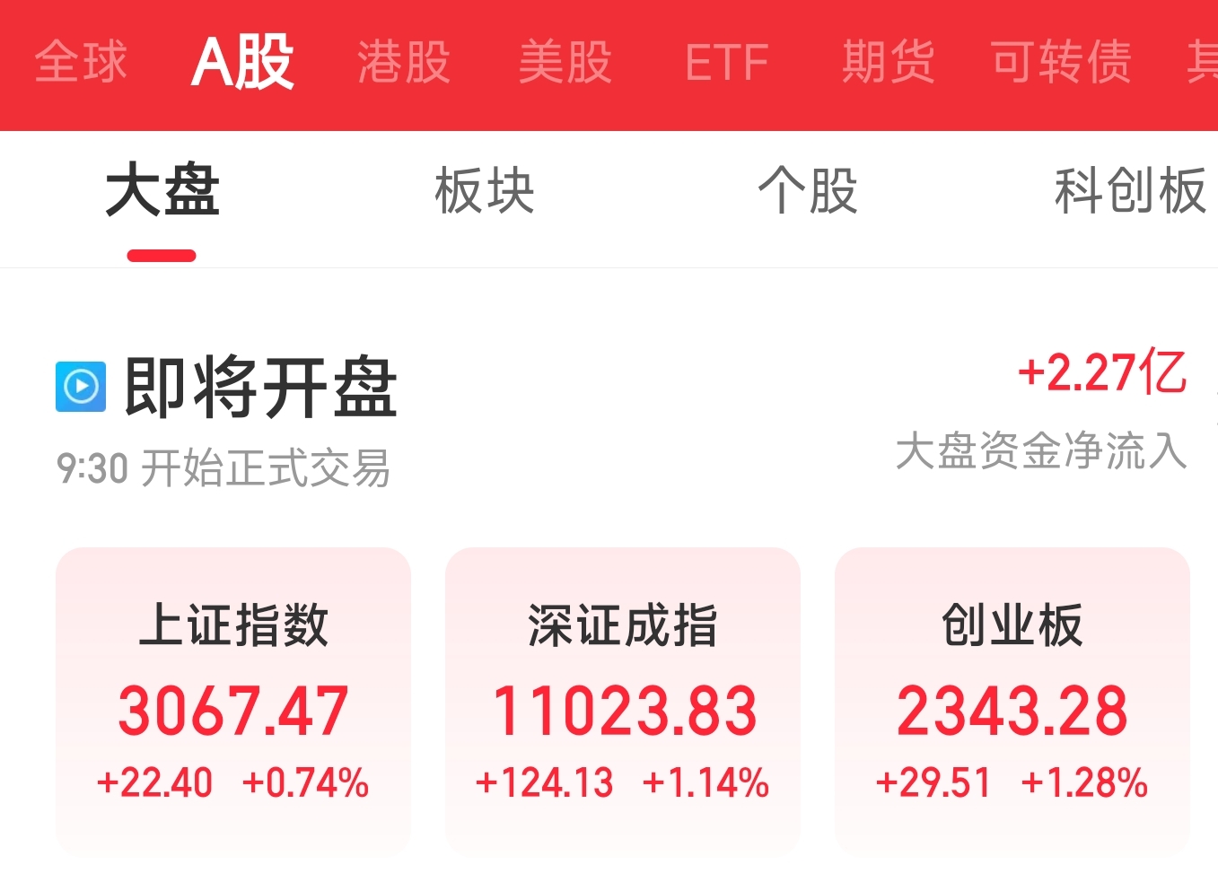中新经纬9月29日电 周四(29日),A股三大指数集体高开。上证指数开盘涨0.74%,报3067.47点;深证成指涨1.14%,报11023.83点;创业板指涨1.28%,报2343.28点。深两市所有交易个股涨跌比为4020:359,两市涨停7家,跌停3家。