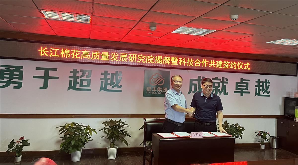 湖北日报讯(记者汪彤、通讯员王琼珊、刘巧林)9月23日下午,“长江棉花高质量发展研究院揭牌暨银丰股份和省农科院科技合作共建签约仪式”在武汉银丰大厦举行。未来,双方将联合开展适合长江流域的棉花育种、机械化种植生产及加工等技术研发和棉花大数据应用与棉花线上交易平台建设等方面研究,着力打造以棉花产业机械化、自动化为主导的产业链,深化棉花产学研深度融合,以科技赋能乡村振兴,助推长江流域棉花高质量发展。