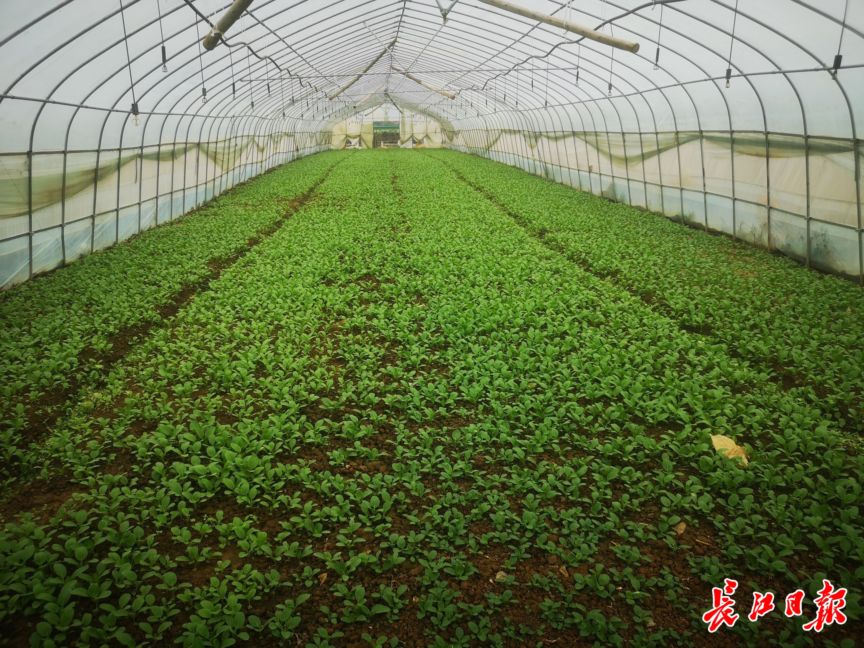 在中湾村中心地带有一个清澈的大水塘,在水塘的另一边是由市退役军人事务局等单位提供主要帮扶资金建起的蔬菜产业园。产业园里整齐排列着24个大棚,种植面积16余亩,主要种植快生蔬菜,大棚里滴灌设施齐全,小白菜青翠欲滴。
