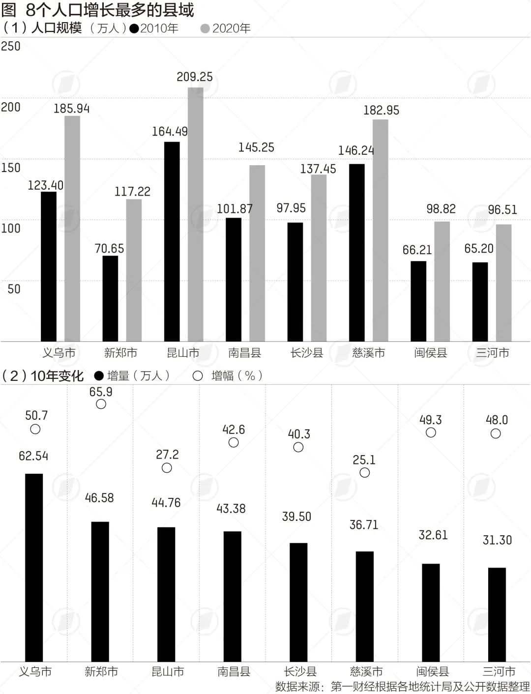 数据显示,从2010年到2020年,共有8个县域人口增量超过30万人,分别是义乌市、新郑市、昆山市、南昌县、长沙县、慈溪市、闽侯县和三河市。分省份来看,浙江有2个,河南、江苏、福建、湖南、江西和河北各1个。