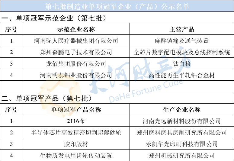 【大河财立方消息】10月25日消息,据河南省工业和信息化厅,工业和信息化部、中国工业经济联合会近日组织开展了第七批制造业单项冠军企业(产品)培育遴选和第一批、第四批制造业单项冠军企业(产品)复核工作,并已完成相关审核。