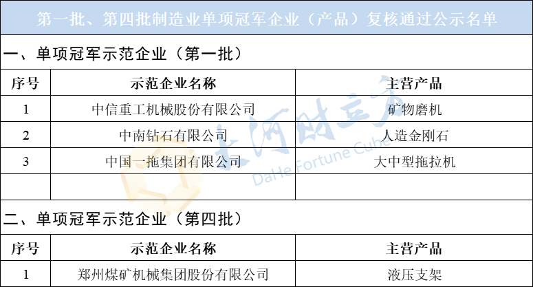 此外,中信重工机械股份有限公司、中南钻石有限公司、中国一拖集团有限公司通过第一批制造业单项冠军企业复核,郑州煤矿机械集团股份有限公司通过第四批制造业单项冠军企业复核。