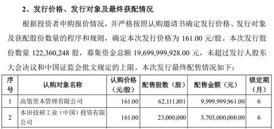 事实上,早在2020年7月,本田技研便成为宁德时代股东之一。根据宁德时代2020年7月30日发布《非公开发行股票上市公告书》显示,定增价格为161元/股,发行股份数量1.22亿股,募集资金总额197亿元。其中,本田技研获配2300万股,配售金额37.03亿元。