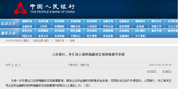 10月25日,为进一步完善全口径跨境融资宏观审慎管理,增加企业和金融机构跨境资金来源,引导其优化资产负债结构,人民银行、外汇局决定将企业和金融机构的跨境融资宏观审慎调节参数从1上调至1.25。