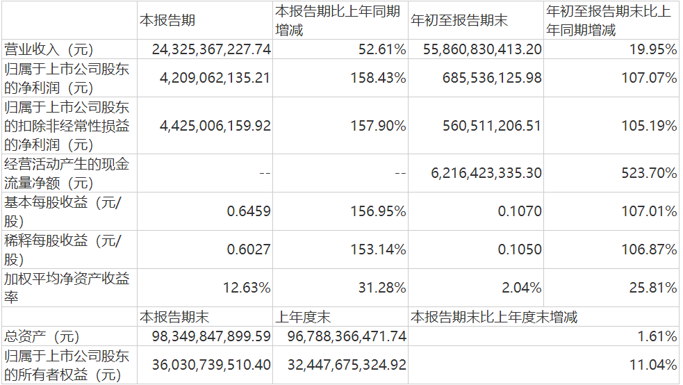 【大河财立方消息】10月25日,温氏股份披露三季度报,今年前三季度实现营业收入558.61亿元,同比增长19.95%;净利润6.86亿元,上年同期净亏损97.01亿元,扭亏为盈;基本每股收益0.107元,上年同期基本每股收益-1.5273元。其中,第三季度243.25亿元,同比增长52.61%;净利润42.09亿元,同比增长158.43%。