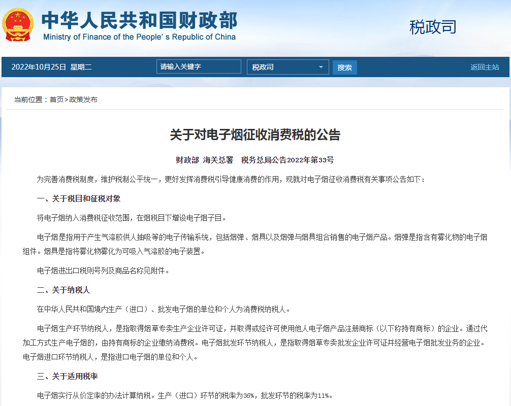 《关于对电子烟征收消费税的公告》