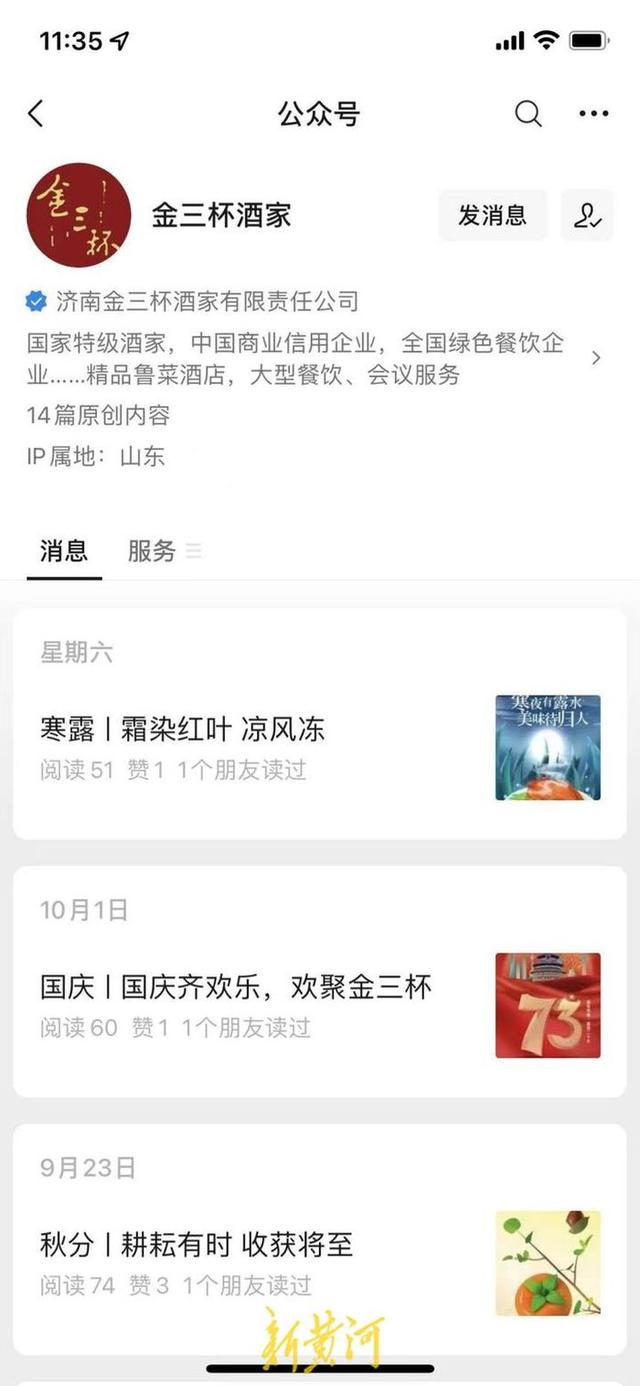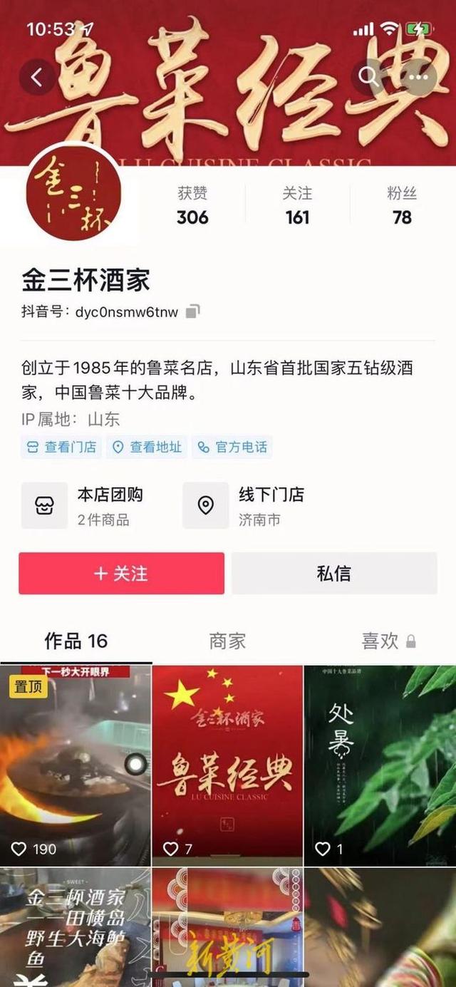 在“打卡探店”营销风行、吃货“跟着点评去选店”的潮流趋势下,金三杯酒家在网络空间的低调令人意外。金三杯酒家的微信公众号共有14篇原创内容,近两年多数文章为节气提醒,仅一篇文章阅读量过千。其抖音账号有78名粉丝,16条作品,最吸睛的作品被点赞190次。抖音上,金三杯酒家的团购套餐,共售出25份。大众点评网站上,整个9月,共5名消费者对金三杯酒家作出评价。