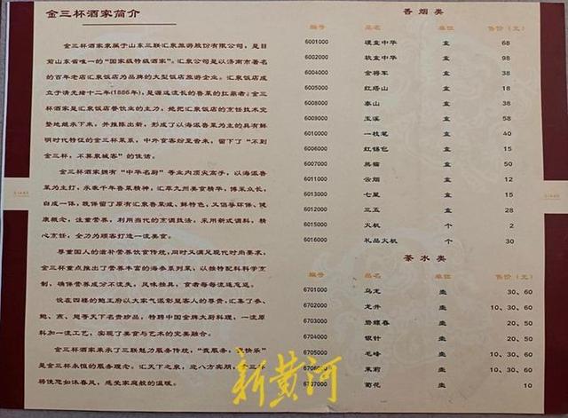 孔夫子旧书网上淘到的一份2000年代的金三杯夜宵菜单,上面标注的香烟、茶水价位彰显了其定位。新黄河记者周全 摄