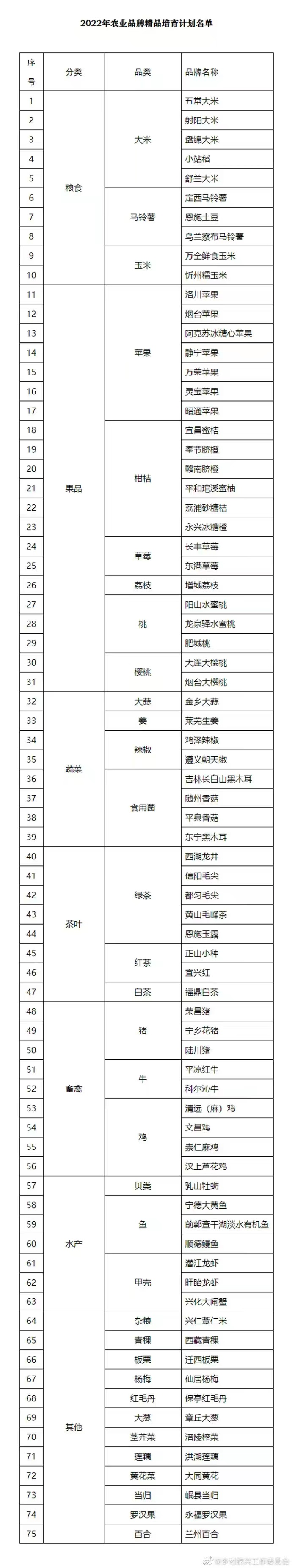 近日,农业农村部发布公告,公示《2022年农业品牌精品培育计划名单》,75个农业品牌纳入2022年农业品牌精品培育计划,其中恩施土豆、宜昌蜜桔、随州香菇等6个湖北农产品牌名列其中。