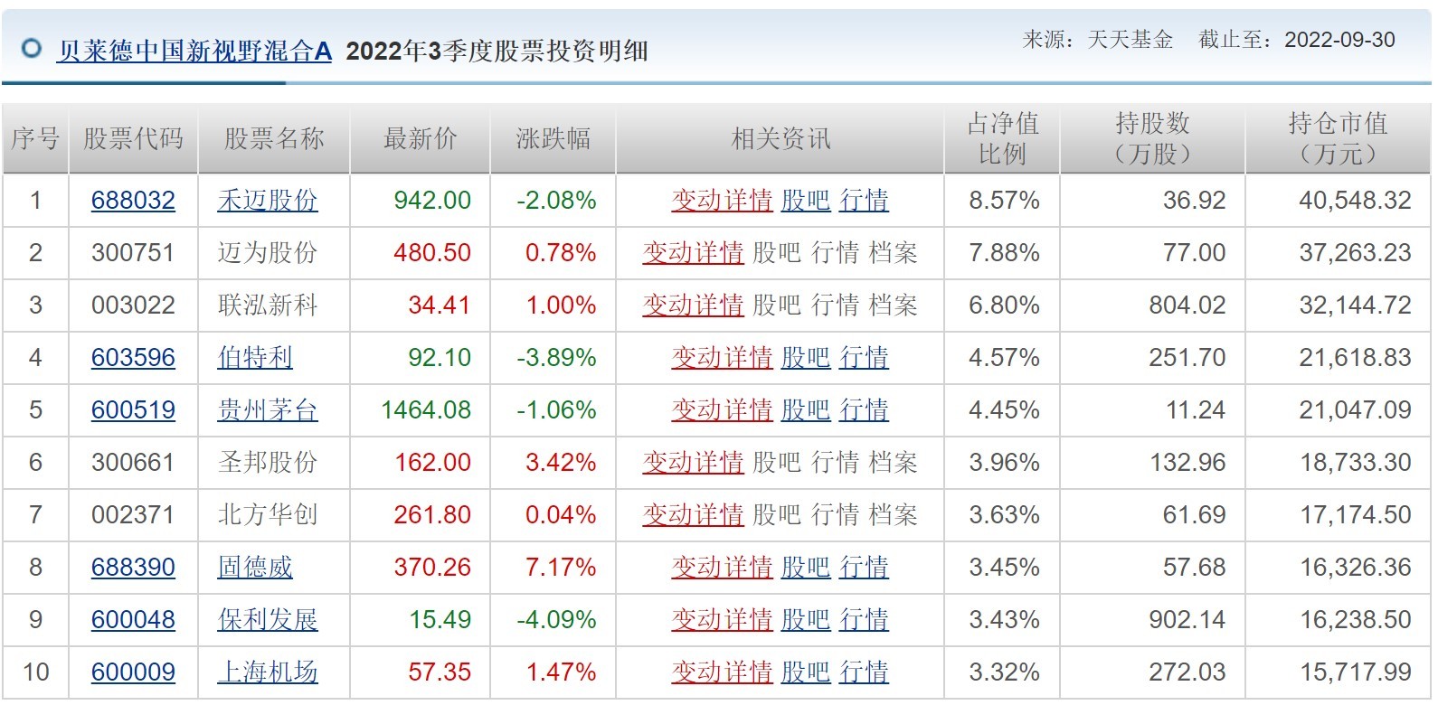 该基金前十大重仓股中,新调入半导体股北方华创,并增持迈为股份、保利发展和上海机场,增持数量分别为5.29万股、82.16万股和132.72万股。减持榜单上,二季末的头号重仓股固德威,在三季度期间减持67.52万股退至第八大重仓股。