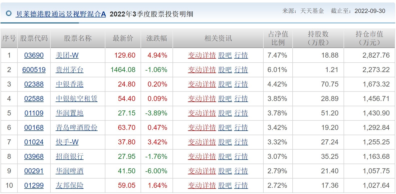 重点布局港股市场的贝莱德港股通远景视野基金,其三季报显示,青岛啤酒股份、快手-W新进前十大重仓股,减持了美团-W、招商银行、贵州茅台。不过,美团和贵州茅台仍是超配地位,位于前两位。