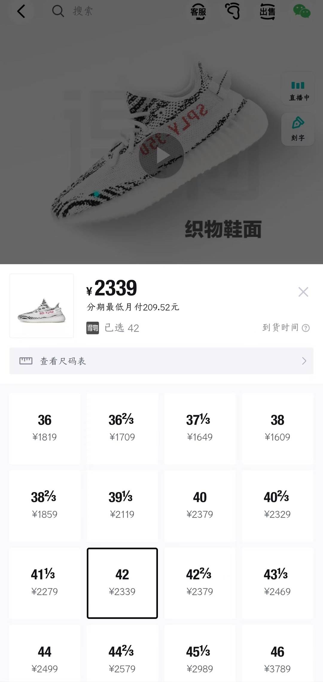 记者注意到,以42码的Yeezy 350 V2“白斑马”配色为例,2016年的首发版本在某潮鞋App转售价超过3000元,但2022版的转售价已经在2000元上下徘徊,部分码数甚至比发售价还低。