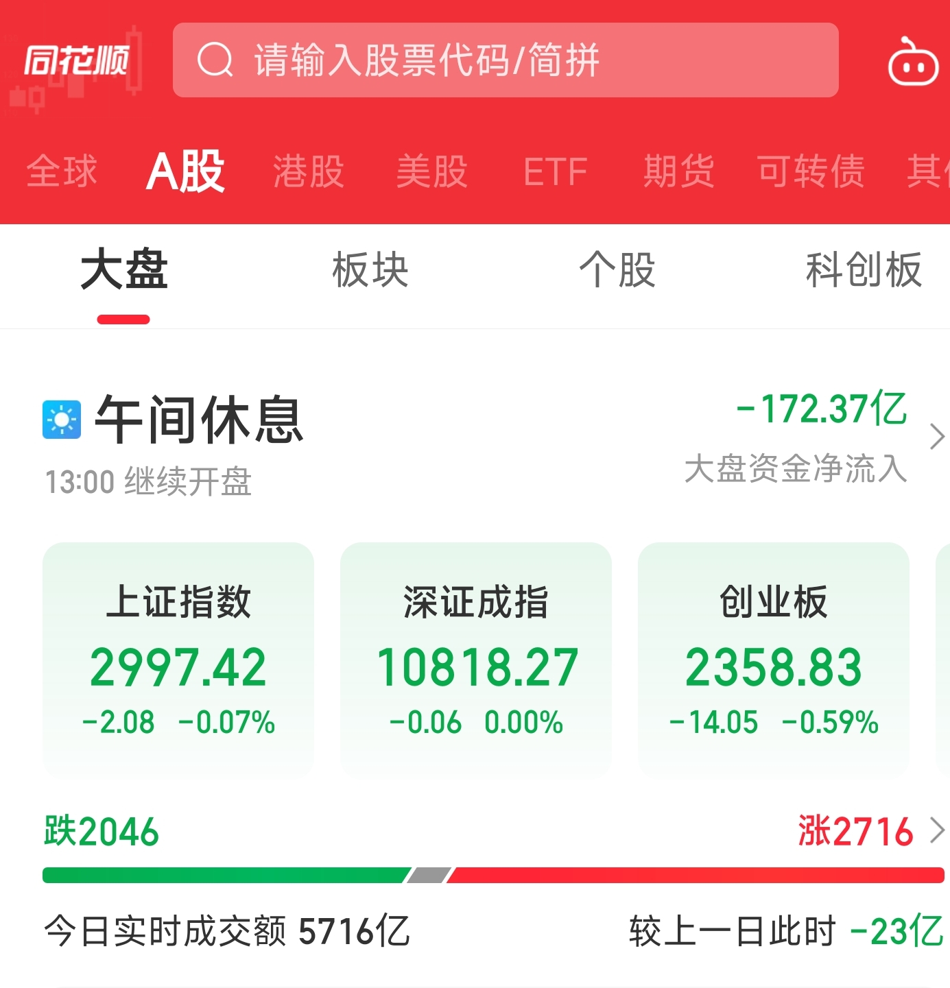 中新经纬10月27日电 27日,A股三大指数高开震荡下行,临近午盘悉数翻绿。截至午间收盘,上证指数跌0.07%,报2997.42点;深证成指基本平收,报10818.27点;创业板指跌0.59%,报2358.83点。沪深两市所有交易个股涨跌比为2716:2046,两市涨停38家,跌停9家。