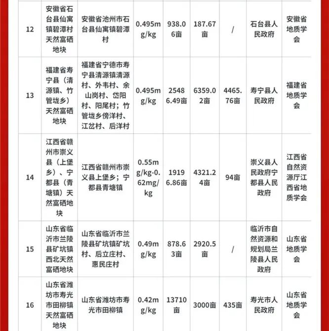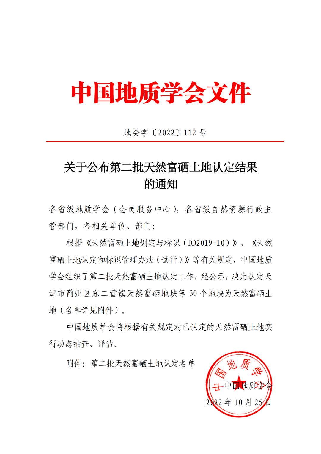 2022年10月25日,中国地质学会正式下发通知,认定、公布第二批30个天然富硒土地地块。其中,山东省临沂市兰陵县矿坑镇3799.1亩天然富硒地得到认定。