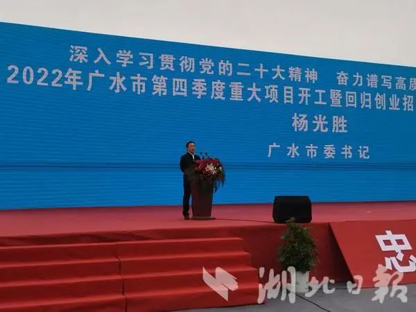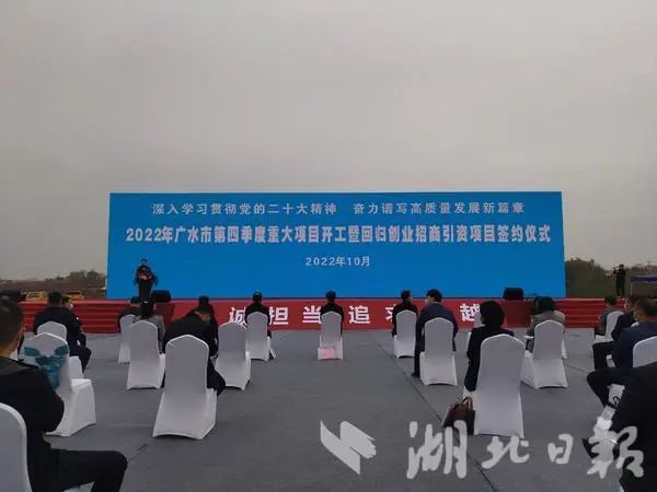 10月27日,广水市第四季度重大项目集中开工暨回归创业招商引资项目集中签约活动在该市回归创业园隆重举行,20个重大项目集中开工,24个项目集中签约,涵盖工业、农业、文旅等领域,总投资74亿元。