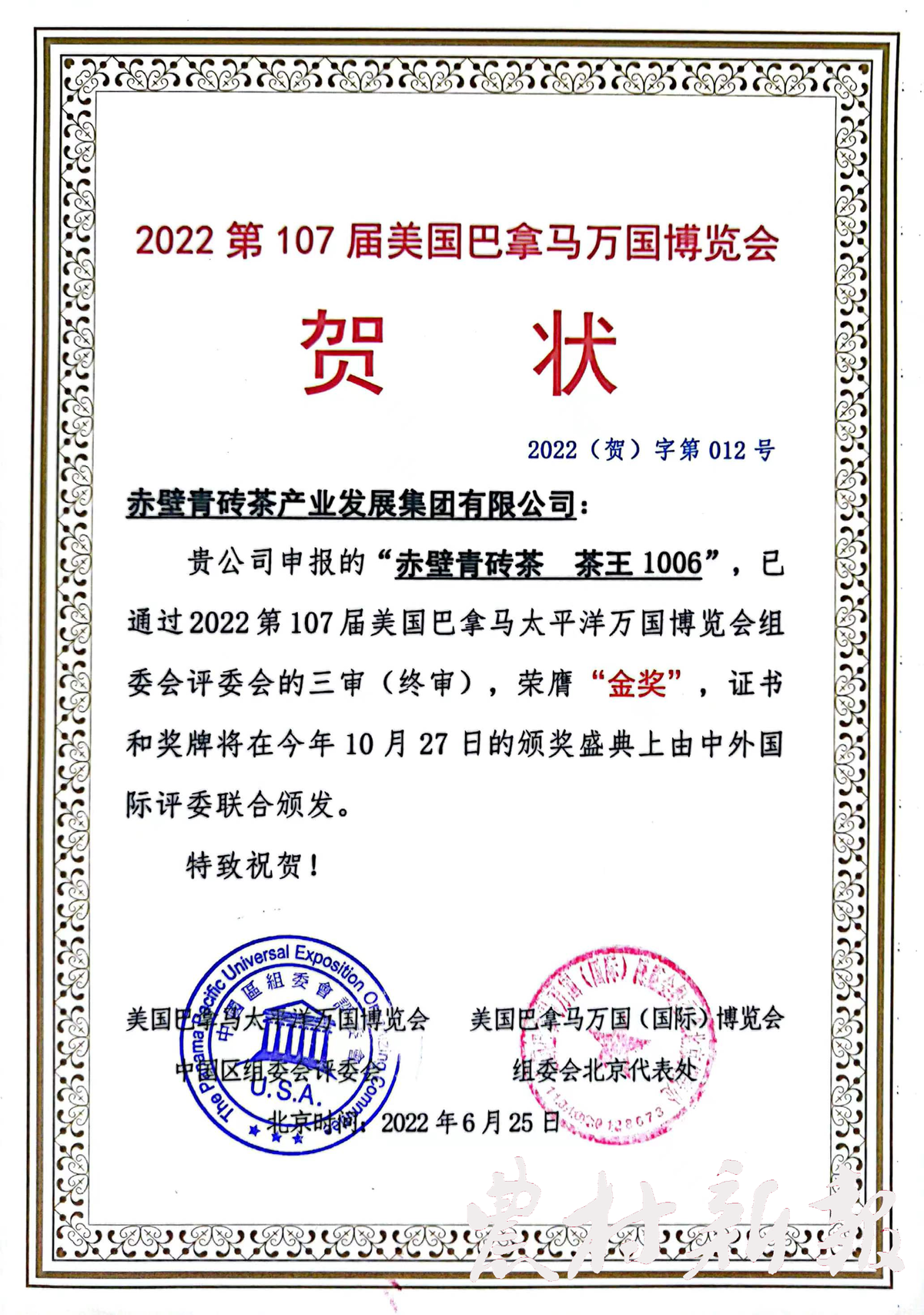 为进一步提升“赤壁青砖茶”品牌知名度和影响力,今年6月,赤壁青砖茶产业发展集团向美国巴拿马太平洋万国博览会中国区组委会提交了茶产品金奖参评申请,通过中国区评委会的一、二审评选,顺利进入美国巴拿马太平洋万国博览会组委会总部三审评选.经过581项欧盟茶叶农残指标检测,“赤壁青砖茶-茶王1006”依靠过硬品质最终获得评委认可,荣获金奖。