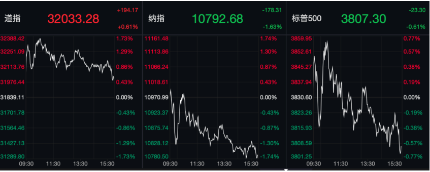 据Wind数据,截至收盘,道琼斯工业指数涨0.61%,报32033.28点;标普500指数跌0.61%,报3807.3点;纳斯达克指数跌1.63%,报10792.68点。