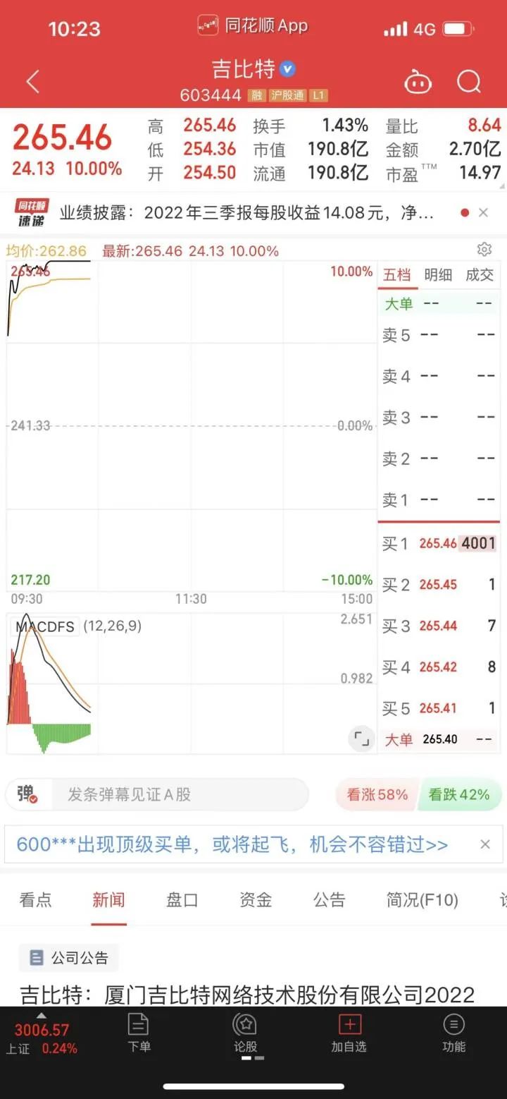 今天一早,吉比特高开高走,不久封涨停板,报265.46元,总市值191亿元,最后以涨停收盘。