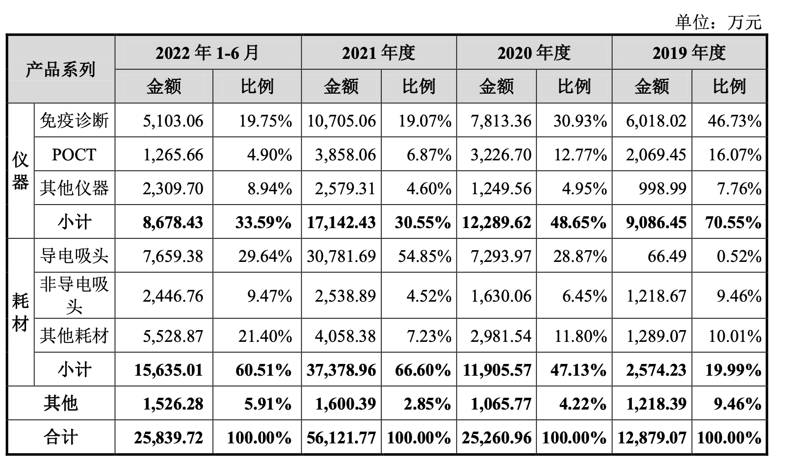 在此过程中,凯实生物产品收入结构由以仪器为主转变为仪器和耗材并重,在疫情期间还出现了耗材营收占比超过仪器的现象。招股书显示,2019年至2022年1-6月(以下简称为报告期),凯实生物耗材业务收入分别为2574.23万元、1.19亿元、3.74亿元、1.56亿元,占主营业务收入比重依次为19.99%、47.13%、66.6%、60.51%。