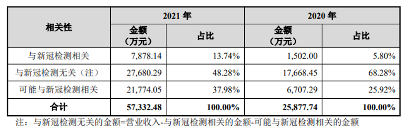 根据凯实生物首轮问询披露,公司仪器产品与新冠疫情相关度很低,仅有一款设备博奥赛斯“化学发光免疫分析仪Axceed360”可用于新冠相关的检测,其近两年收入占比仅为2.06%;但公司耗材产品中COVID-19反应板条、导电吸头等与新冠疫情具备一定关联性。因此,总的来看,2020年至2021年,凯实生物与新冠检测相关或可能与新冠检测相关的营收占比合计分别达到31.72%、51.72%。
