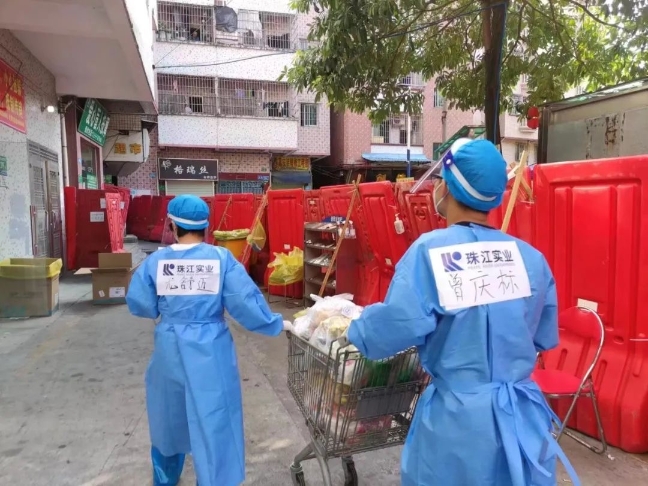 10月的广州依旧艳阳高照,穿着防护装备的夫妇俩感到很是闷热,但为了让居民尽快拿到物资,每次派送夫妇俩都会往手推车上装尽可能多的物资,然后再合力推进巷子里派送给各家各户。每车的物资约等于一个成年人的重量,一趟下来往往大汗淋漓、疲惫不已,但考虑到居民还在焦急等待,他们又会毫不犹豫地又投入到下一轮工作当中。
