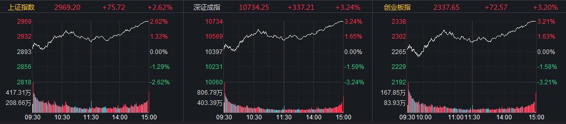 截至收盘,上证指数涨2.62%,报2969.20点。深证成指涨3.24%,报10734.25点。创业板指涨3.20%,报2337.65点。
