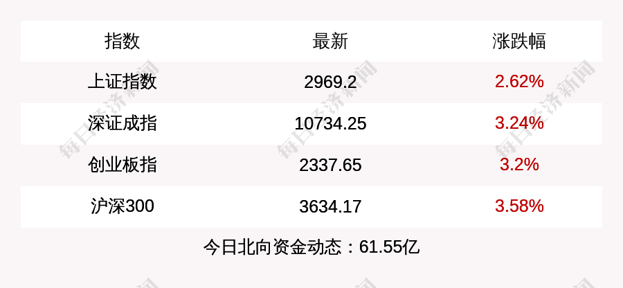 北京时间11月1日15:00,上证指数收盘上涨75.72点,涨幅为2.62%,报收2969.2点,成交额4310.16亿元;深证成指收盘上涨337.21点,涨幅为3.24%,报收10734.25点,成交额5465.31亿元;创业板指收盘上涨72.57点,涨幅为3.2%,报收2337.65点,成交额1951.9亿元;沪深300收盘上涨125.47点,涨幅为3.58%,报收3634.17点,成交额2950.9亿元。