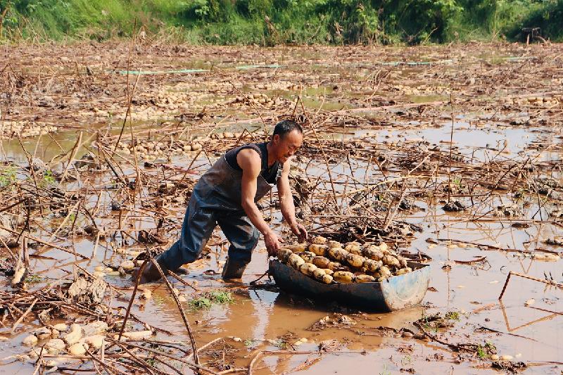 在连片莲藕种植园里,挖藕工人们正在田里辛勤劳作,密切配合,确保及时将新鲜的莲藕供货给泸州海吉星、重庆双福等农产品批发市场,成为市民餐桌上的美食。
