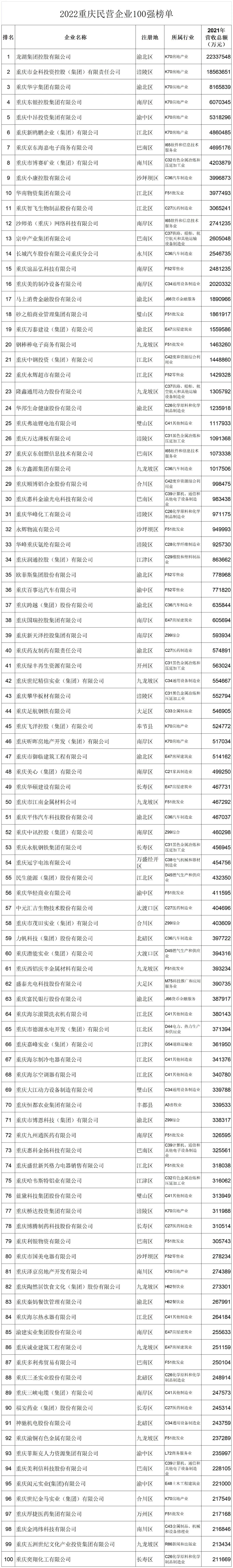 11月2日,重庆市工商联发布了2022重庆民营企业100强榜单。龙湖集团控股有限公司以年营收总额2233.75亿元列榜首,重庆市金科投资控股(集团)有限责任公司、重庆华宇集团有限公司、重庆东银控股集团有限公司、重庆中昂投资集团有限公司、重庆新鸥鹏企业(集团)有限公司、重庆京东海嘉电子商务有限公司、重庆市博赛矿业(集团)有限公司、重庆小康控股有限公司、华南物资集团有限公司排名前十位。
