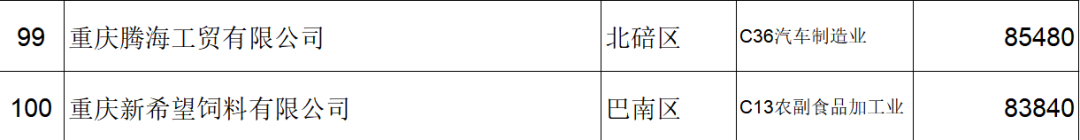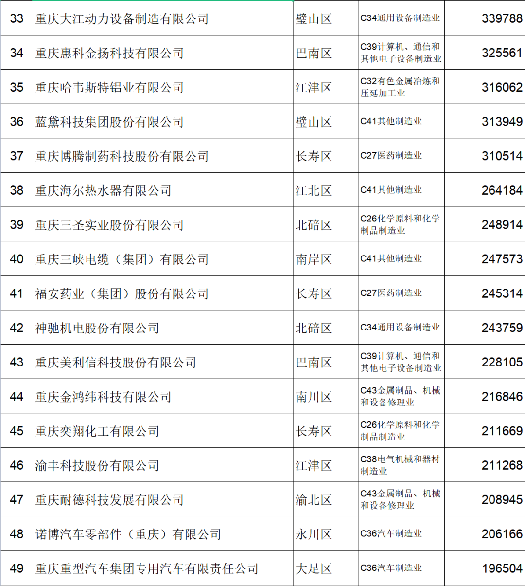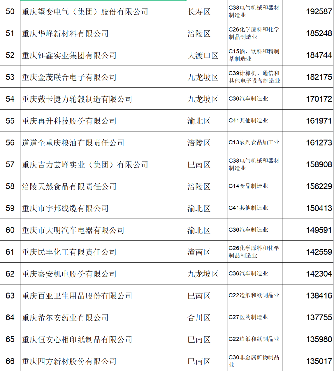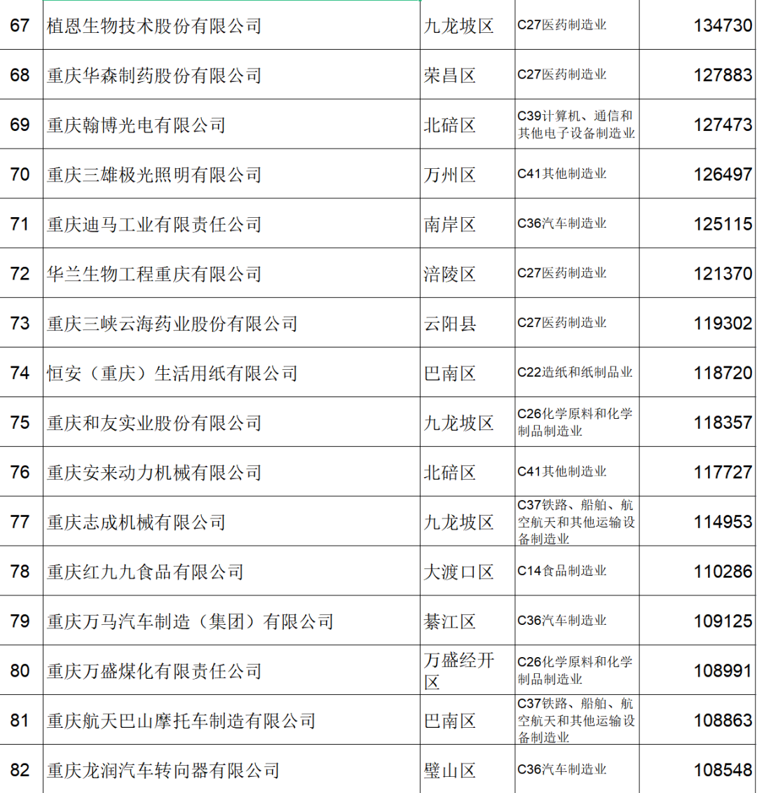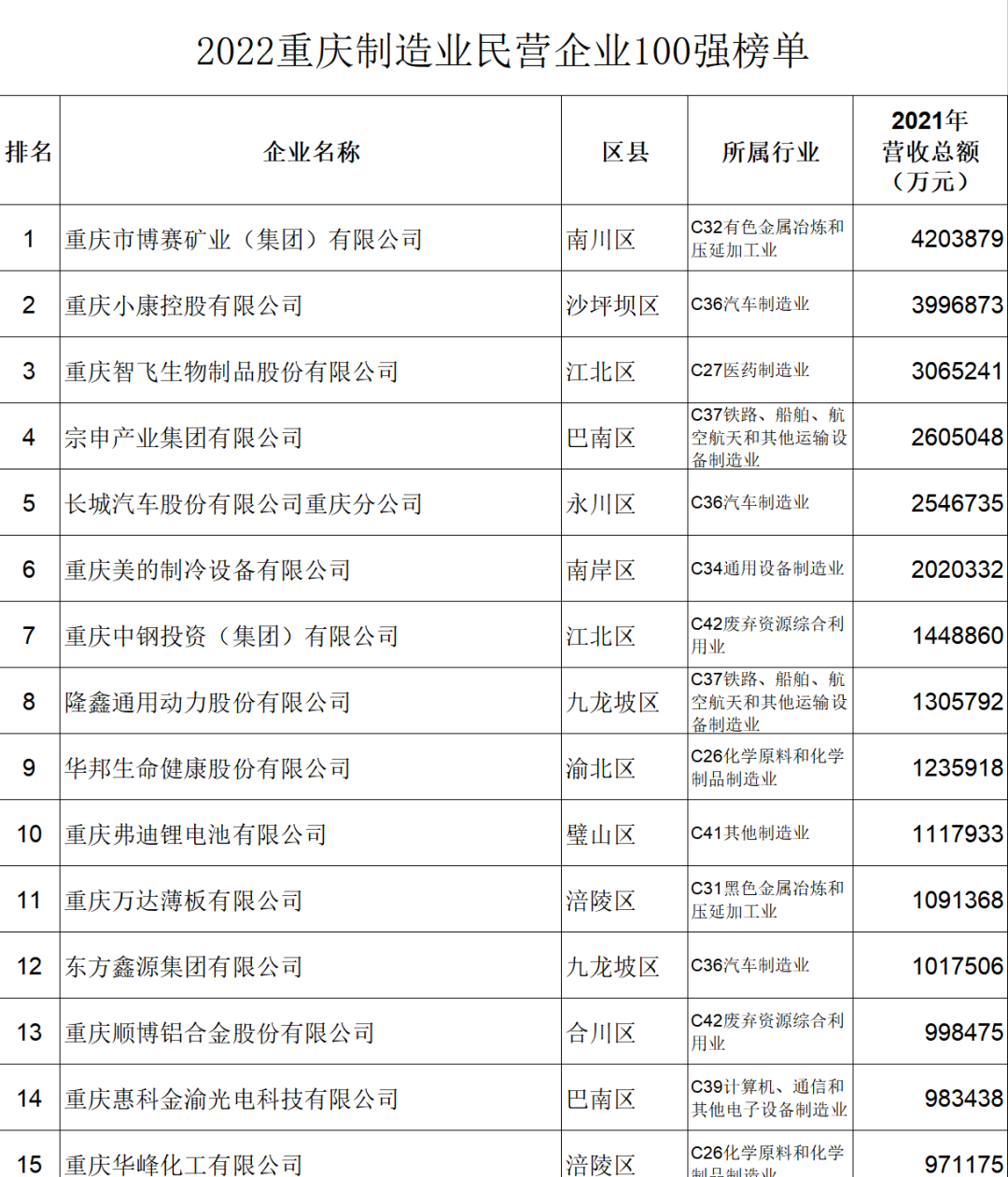 为贯彻全市推动制造业高质量发展大会精神,与重庆民营企业100强同时发布的还有制造业民营企业100强榜单,重庆市博赛矿业(集团)有限公司获制造业榜单榜首,重庆小康控股有限公司、重庆智飞生物制品股份有限公司、宗申产业集团有限公司、长城汽车股份有限公司重庆分公司、重庆美的制冷设备有限公司、重庆中钢投资(集团)有限公司、隆鑫通用动力股份有限公司、华邦生命健康股份有限公司、重庆弗迪锂电池有限公司排名前十位。