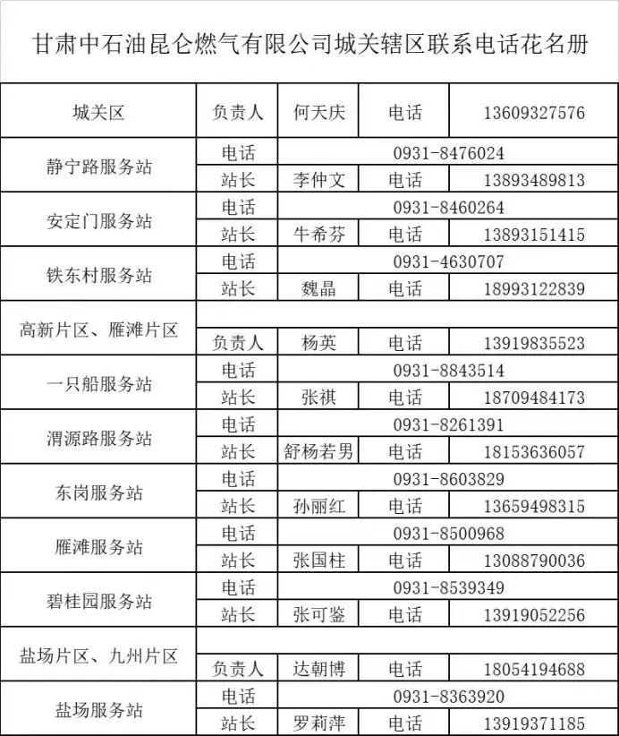 附件:甘肃中石油昆仑燃气有限公司城关辖区联系电话花名册