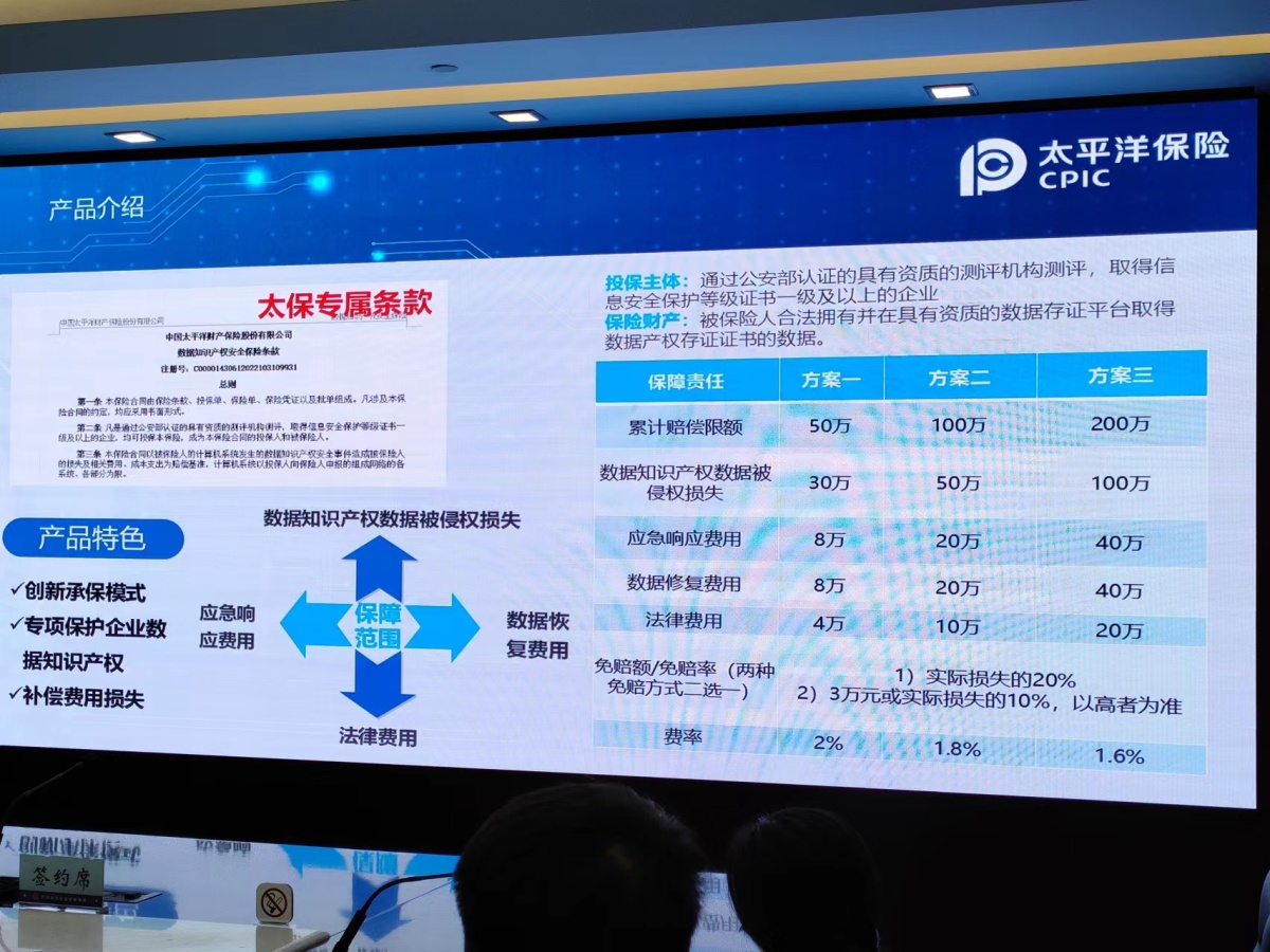 “我们公司现运营食品安全、网络监测等多个服务平台,累积重要数据超7000万条。一旦发生数据侵权事件,要恢复或重新获取,需耗费大量人力财力。有这份保险兜底,我们安心多了。”浙江商安信息科技有限公司相关负责人与保险公司现场签约,企业核定保费1万元,约定若发生数据知识产权安全事件,可获得最高50万元的赔偿。