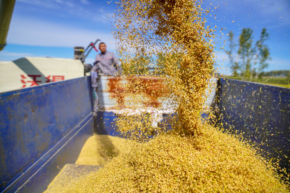 上图:在吉林省长春市九台区龙嘉农乐种植家庭农场,农民操作农机将收获的水稻送入拖拉机。张楠摄