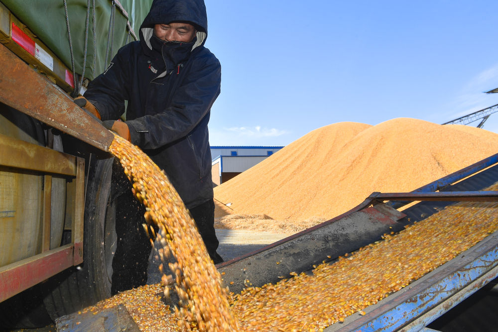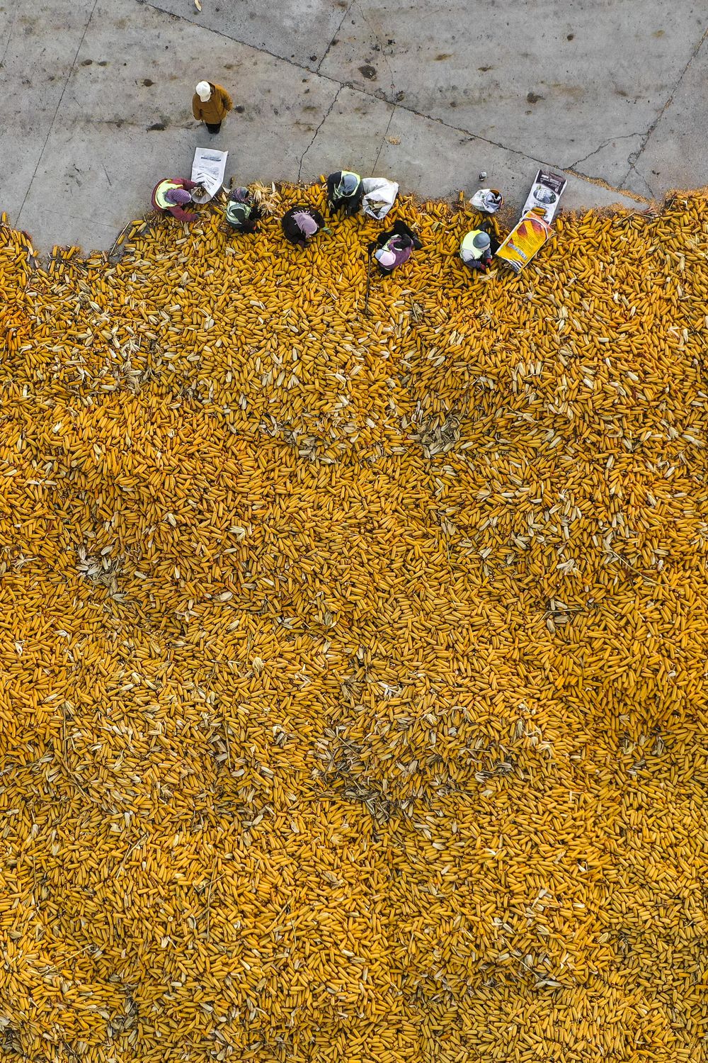 上图:在吉林省公主岭市环岭街道土城子村志和农机服务专业合作社内,农民分拣收获的玉米,为下一步的存储做准备。许畅摄