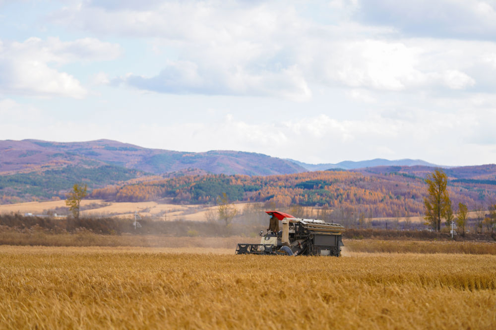 上图:在吉林省延边朝鲜族自治州和龙市光东村,农民驾驶农机收割水稻。颜麟蕴摄