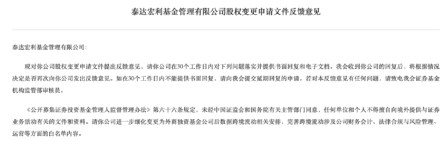 据证监会官网,证监会日前对泰达宏利基金股权变更给出了反馈意见。根据意见,泰达宏利需要解释公司变为外商独资公司之后的涉及的数据跨境流动等问题。据了解,“反馈意见”是证券基金经营机构在申请股权变更时经历的常规程序之一。